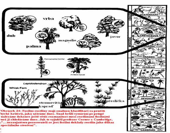 Jiné fosilní rostliny klasifikujeme tak snadno jako rostliny kvetoucí. Kapraďorosty a jejich příbuzní se objevují náhle a zároveň v silurských/devonských horninách v daleko větší rozmanitosti než máme dnes (obr. 24). Ale žádná z těchto fosilních rostlin nemá žádné rysy ve své anatomii, morfologii či rozmnožování, jež bychom těžko chápali v termínech, které pozorujeme mezi rostlinami žijícími. Rozdíl je tento: Bývalo daleko více druhů kapraďorostů a jejich příbuzných na zemi, než jich existuje dnes. A některé z nich, jež jsou dnes malé a nenápadné, jako plavuň (Lycopodium) a přeslička (Equisetum) vykazují fosilie podobně stavěné, jež rostly do velké výšky jako stromy. Například stromovité plavuně(Lepidodendron) a stromovité přesličky (Calamites). Strukturální plán a klasifikace rostlin ukazují na stvoření; úbytek výšky a rozmanitosti na regresi a katastrofu, která následovala.